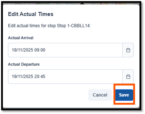 5.1. To make the change on the actual arrival , Please select the date and time. Please note to click on the side before saving in order to make the change on the actual departure. Repeat the above on actual departure. Once done please click on Save